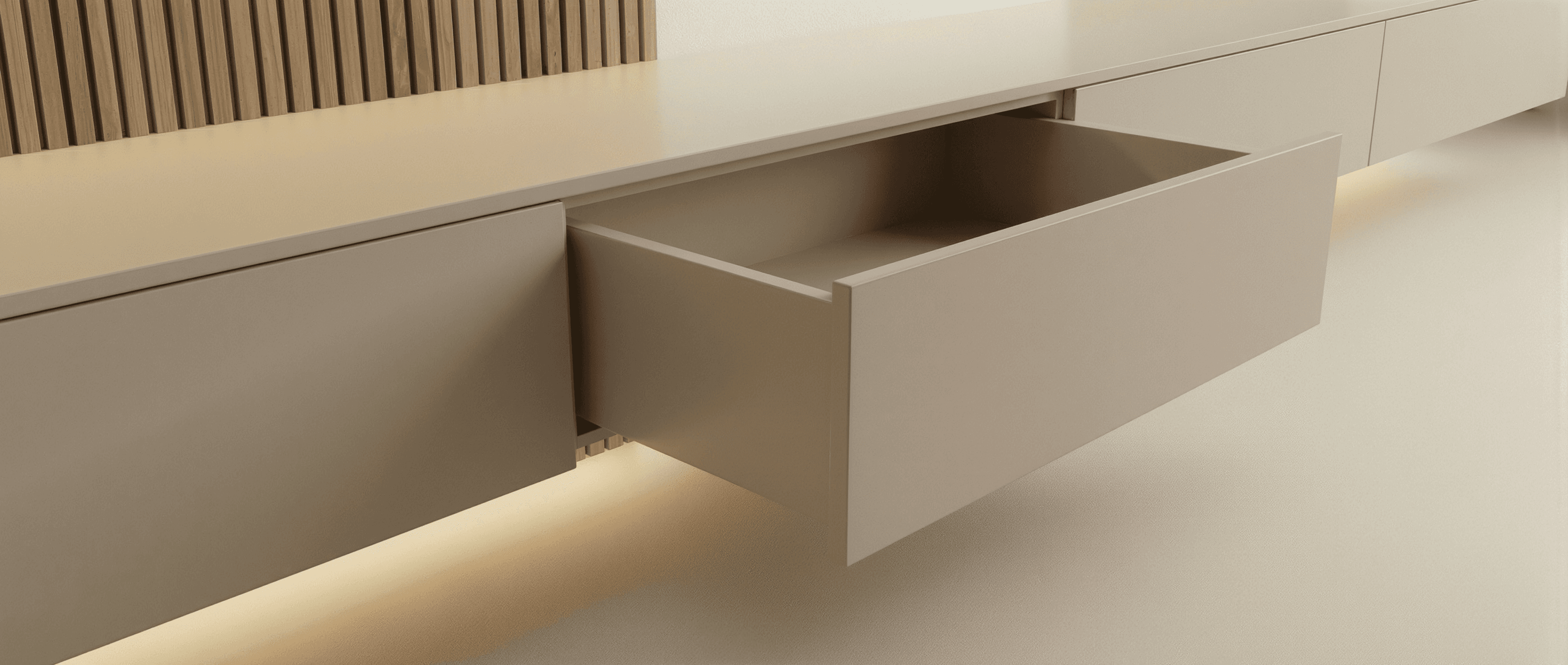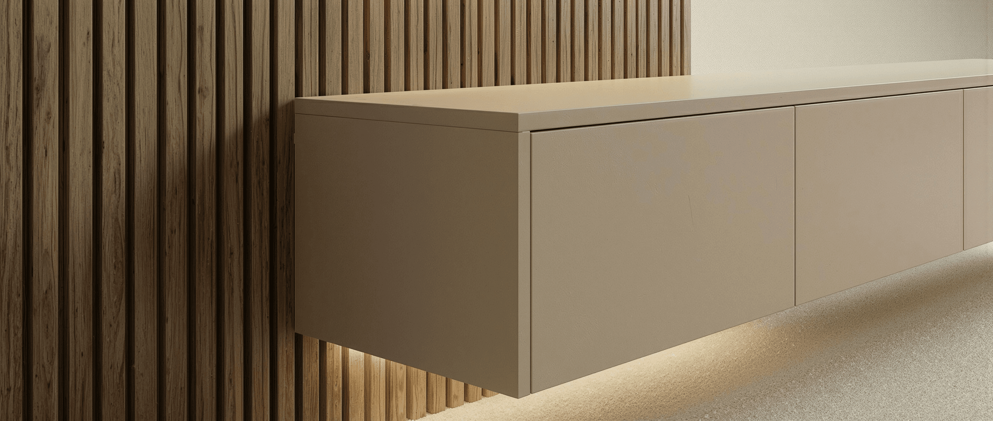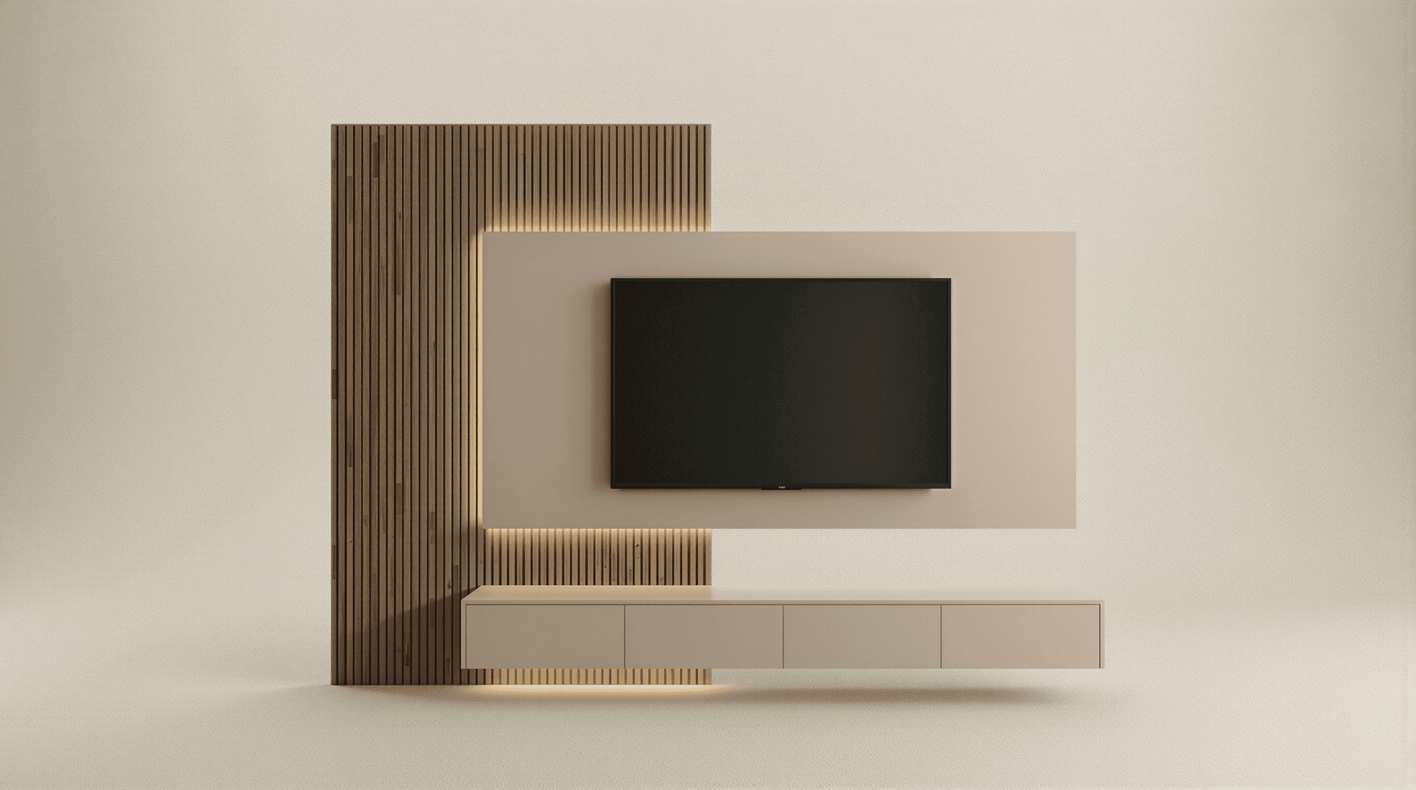 Meet the wall that defines modern minimalism. Vertical slat panels frame your display with architectural precision, while the floating cabinet provides hidden storage below. Customize finishes and add shelving to fit your space - wall panels and cabinet come standard.